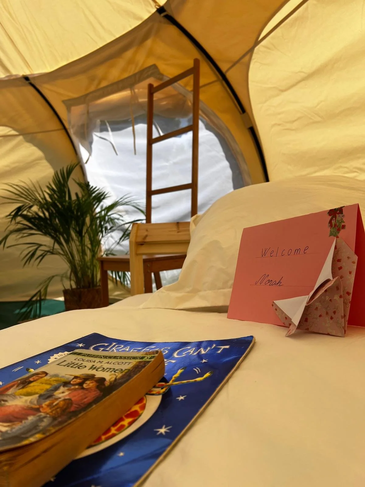 Our beautiful tents with futon beds, chairs and charming little touches to make you feel at home